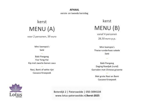 Tijdens 1e en 2e Kerstdag hanteren wij een kleinere kaart. De volgende menu’s/gerechten zijn helaas niet verkrijgbaar bij afhaal:
