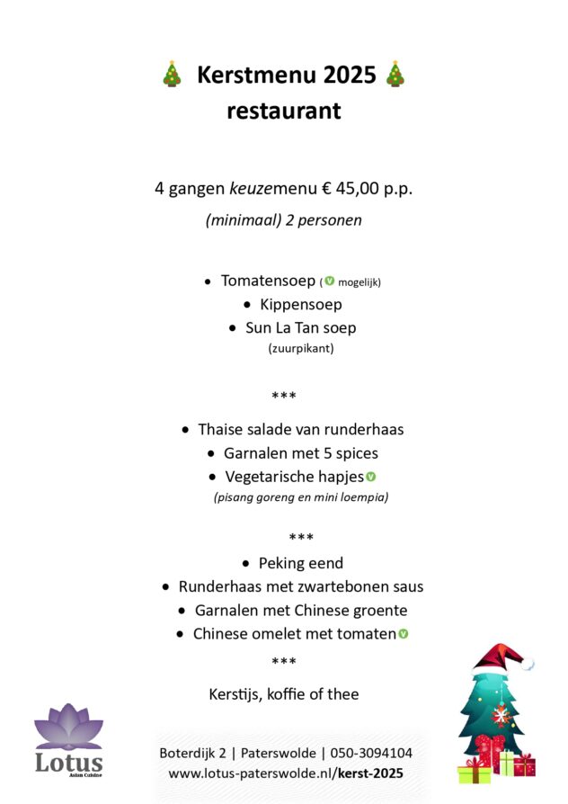 Voor de kerst hebben we een speciaal menu samengesteld met de vertrouwde gerechten die je van ons kent en waar je van houdt. Geniet van een heerlijke maaltijd in ons sfeervol versierde restaurant, terwijl ons team zorgt voor een ontspannen en gezellige kerstavond.
